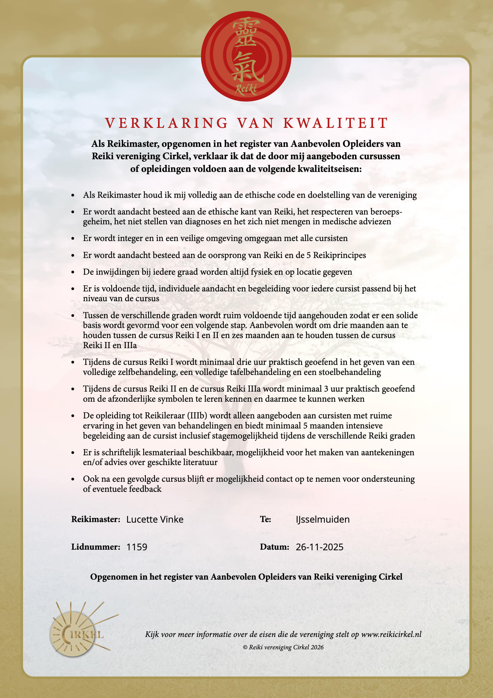 Reiki master-leraar. Je leert anderen in te wijden in elke afzonderlijke Reikigraad. De mastergraad is een persoonlijk traject. Je begint met één dagdeel waarin je één initiatie ontvangt. Je loopt ‘stage’ tijdens cursussen en oefenavonden. Je leert om initiaties en cursussen te geven en hoe een praktijk op te starten en te onderhouden. Je ontvangt een boekenlijst om de kennis in Reiki te vergroten en uit te diepen.